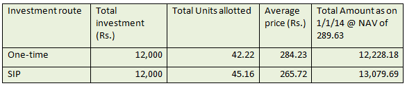 Now, let us examine what would have happened had the investor put in 12,000 as lumpsum on 2nd Jan13 instead of doing a SIP of Rs.1000 per month? Lets us see the results below -